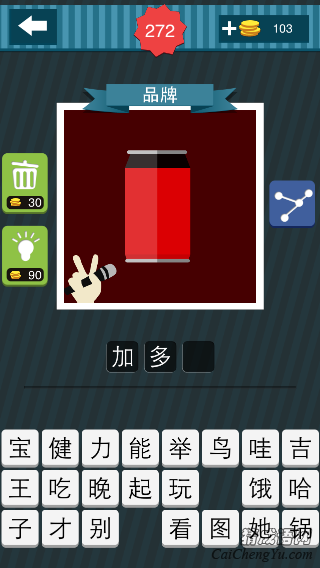 疯狂猜图游戏中,红色的听装饮料 一只拿着话筒的手摆着v字形,答案是什么?