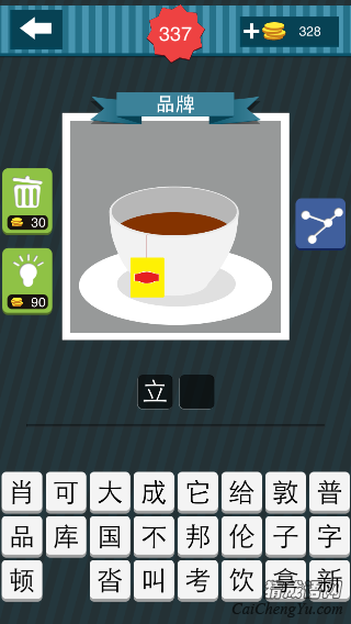 疯狂猜图小碗里泡着一杯褐色的茶插袋是黄色的