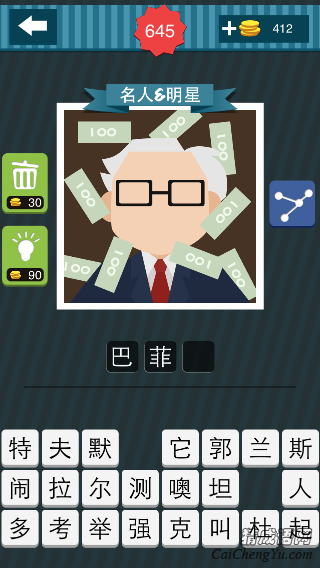疯狂猜图游戏中,黑色方框眼镜的老人 很多100元的钞票,答案是什么?