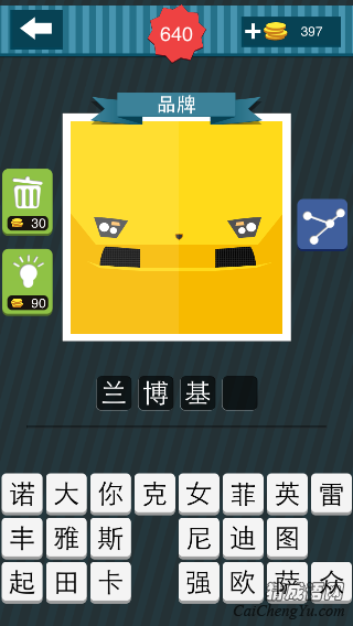 疯狂猜图品牌标志类题目有一关的图片中,一辆黄色的车,答案是哪个公司品牌?