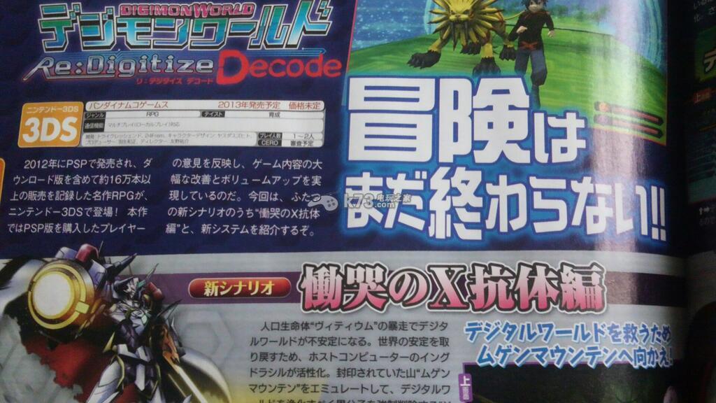 数码宝贝世界复原 解码X抗体编杂志图 本作将于2013年年内发售,游戏的售价尚未判明,3ds版中支持1-2人协力游戏,也算是对PSP版本的一个改进吧!_ K73更