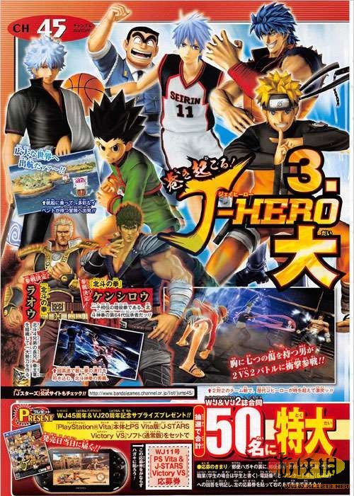 黑子哲也,"JoJo"的乔瑟夫和乔纳森,"地狱老师","圣斗士星矢","驱魔少年",《暗杀教师》与"魔人侦探奈罗",蓝染,弗里萨,户愚吕,斑。 《北斗神拳》健次郎 《JUMP全明星大乱斗V》登陆平台为PS3和PSV,预定于2014年3月19日在日本发售,北美和欧洲发售时间未定。 您...2KB。