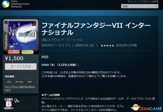 为庆祝其在日本国内300万本的发行量,作为纪念公司推出了《最终幻想VII国际》VII 的游戏档案版(版)。 具体详情: 游戏名:《最终幻想VII国际》Game Archives Version 制造商:史克威尔艾尼克斯 对应平台:PS3/PSV/PSP(下载专用) 类型:RPG
