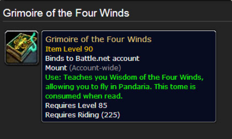 [四风魔法书]:战网通行证绑定,账号通用,使用:教会你四风的智慧,允许你在潘达利亚飞行。书籍在阅读后消失。需要等级85.需要骑术225。 wowhead数据库中挖到了一件传家宝: [四风魔法书]:战网通行证绑定,账号通用,使用:教会你四风的智慧,允许你在潘达利亚飞行。书...6KB。