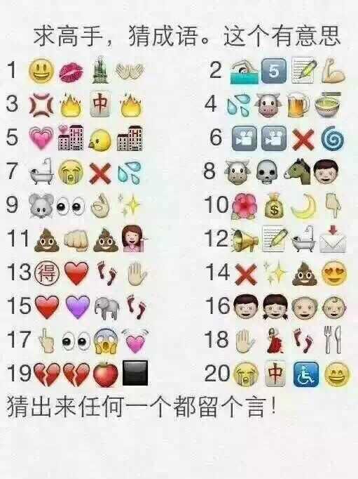 表情 求高手,猜成语 这个有意思 O租心吧 600X⑥ 5 7 0XR 80Ae 9 ee 10 导 11色0鱼0 12397的 13⑥9 心14 鱼 15 17 5oo 180金了 1949 9O园 20 电② 猜出来任何一个都留个言 表情