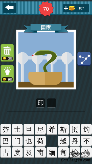 疯狂猜图国家&地区有一关的图片中,一个碗里面有一条绿色的眼镜蛇,答案是哪个国家?